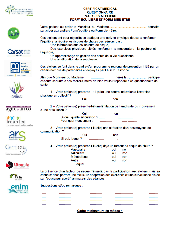 Certificat Médical questionnaire pour les ateliers FORM’ équilibre et FORM’ bien être en pièce jointe 👇️