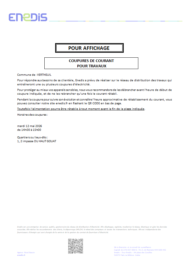 COUPURES DE COURANT POUR TRAVAUX ⚠️ Accueil / Flash Infos / Enedis vous informe d’une coupure d’électricité programmée le 12 Mai 2026 DE 14H00 à 15H00 sur la Commune