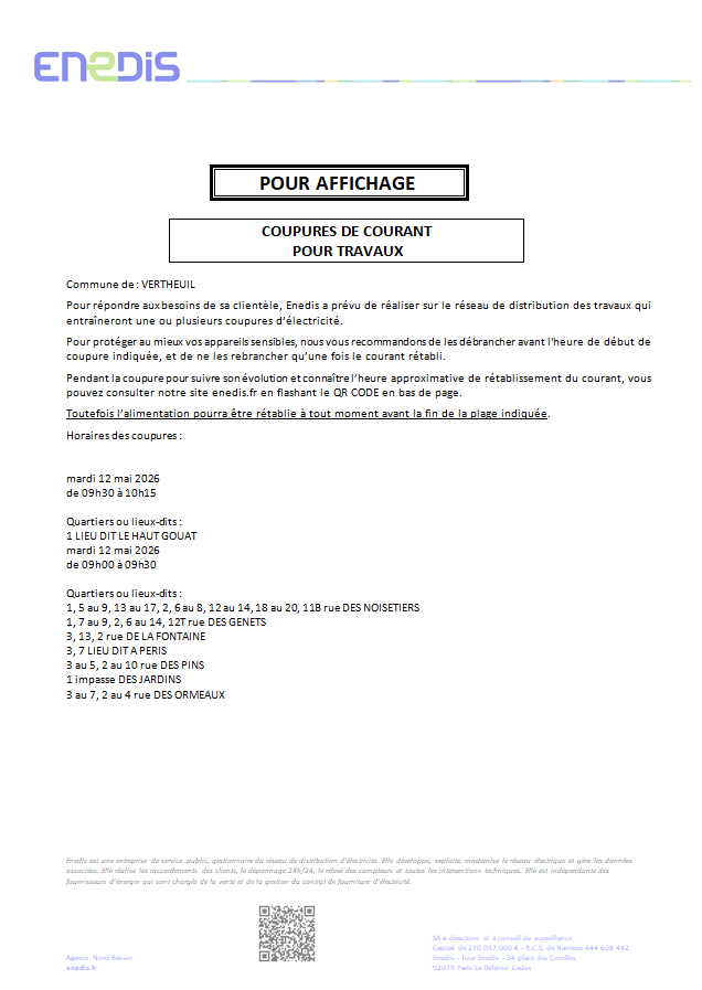Enedis vous informe d’une coupure d’électricité programmée le 12 Mai 2026 sur la Commune